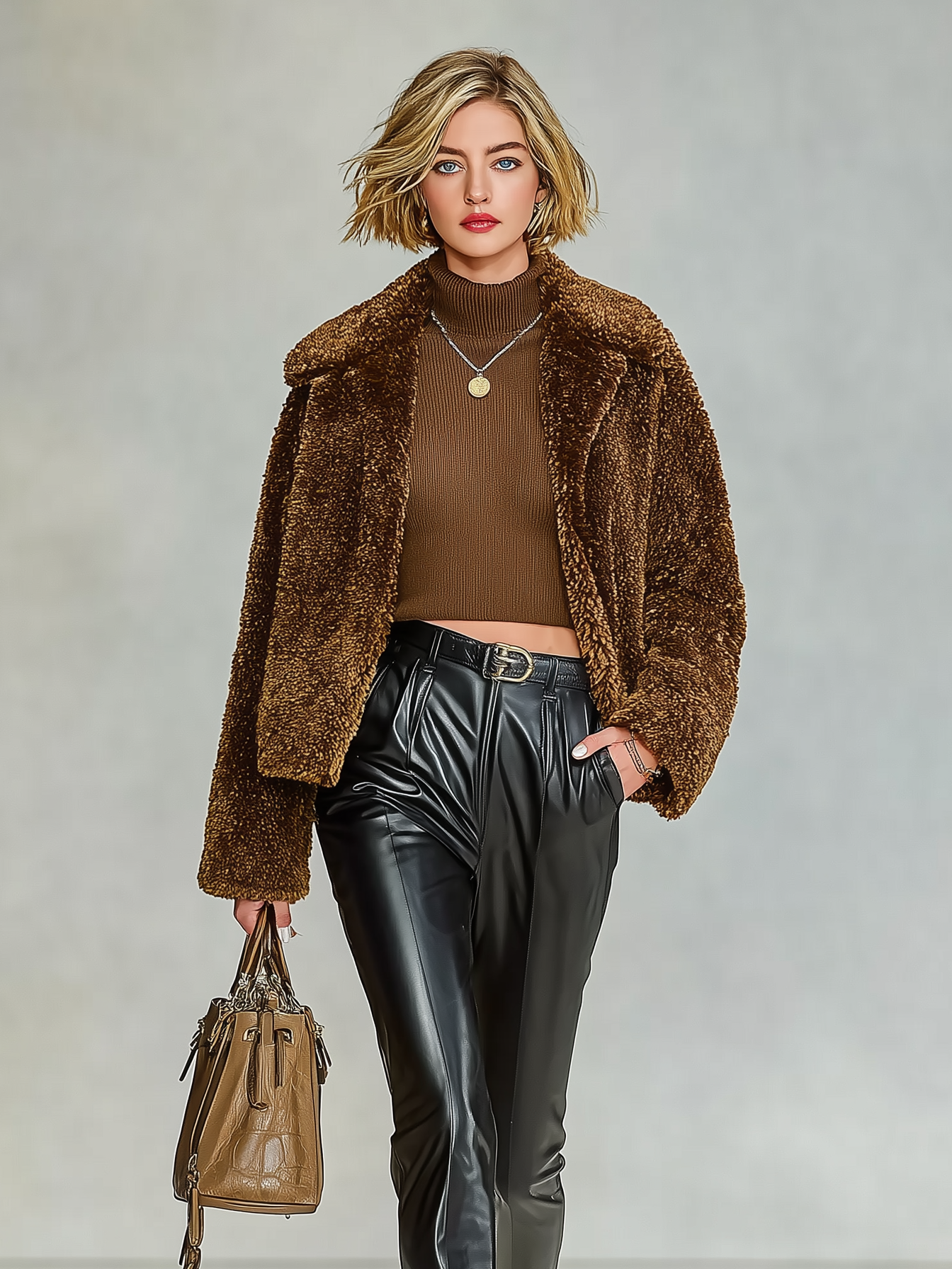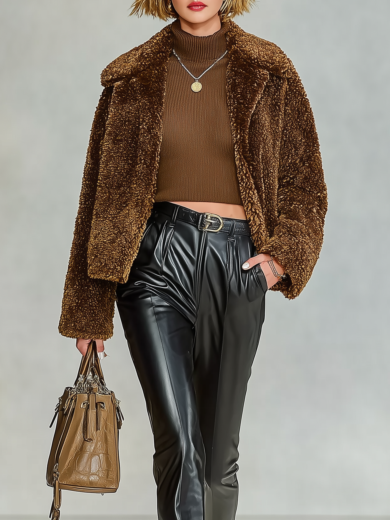 Product description Stay warm and stylish in this short jacket in fleece blend. With a classic lapel design and buttonless front opening, it adds warmth and effortless chic to any outfit.